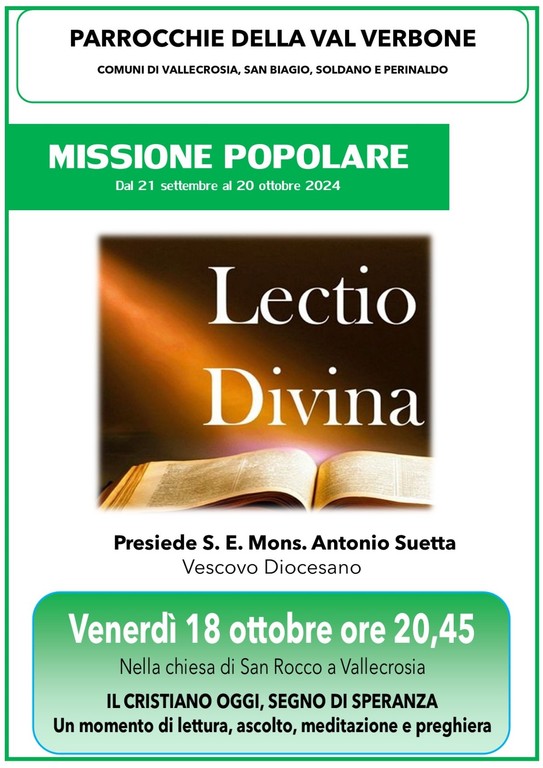 Un momento di lettura, ascolto, meditazione e preghiera verrà proposto domani, il 18 ottobre, alle 20.45, nella chiesa di San Rocco a Vallecrosia. E', infatti, prevista una Lectio Divina con Monsignor Antonio Suetta, vescovo della diocesi Ventimiglia-Sanremo, incentrata su "Il cristiano oggi, segno di speranza".