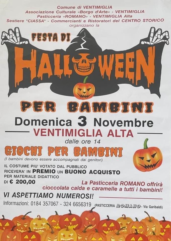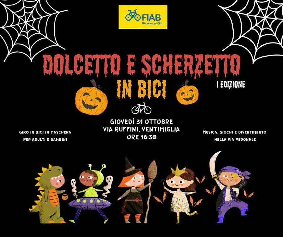 "Si inizierà domenica 27, dalle 14 alle 18, con la tradizionale animazione nell’area antistante la giostra dei giardini pubblici. Parteciperanno per l'occasione i Sestieri Ventimigliesi e associazioni onlus" - fa sapere l'assessore Serena Calcopietro - "Giovedì 31 ottobre vi sarà, invece, 'Dolcetto o scherzetto in bici'. Dalle 16.30, con partenza e arrivo in via Ruffini, è previsto un giro in bicicletta mascherati per le vie cittadine. Al termine, nel tratto pedonale di via Ruffini, vi saranno animazione e intrattenimenti per i bambini. L'evento è organizzato da FIAB (Federazione Italiana Ambiente e Bicicletta) Riviera dei Fiori. Sempre, giovedì 31 ottobre, ma a Cala del Forte, alle 19.30, andrà in scena 'Halloween per grandi'".