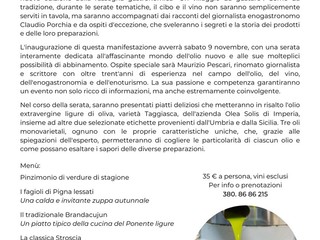 Durante l'evento, saranno presentati piatti deliziosi che esploreranno non solo l'olio extravergine di oliva di varietà Taggiasca, ma anche pregiati oli provenienti da diverse regioni italiane, ognuno con le proprie caratteristiche distintive. Questo viaggio culinario sarà un'opportunità unica per comprendere le peculiarità di ciascun olio e come esse possano esaltare i sapori dei piatti.