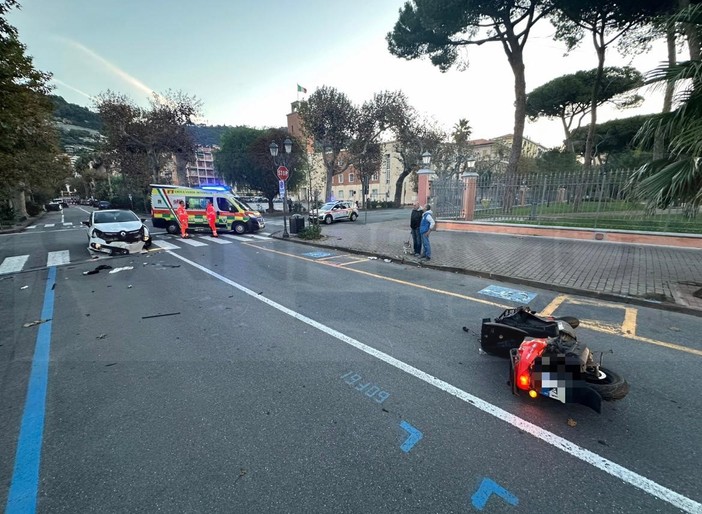 Ventimiglia: scontro auto-moto in via della Repubblica, 55enne portato in elicottero al Santa Corona (Foto)
