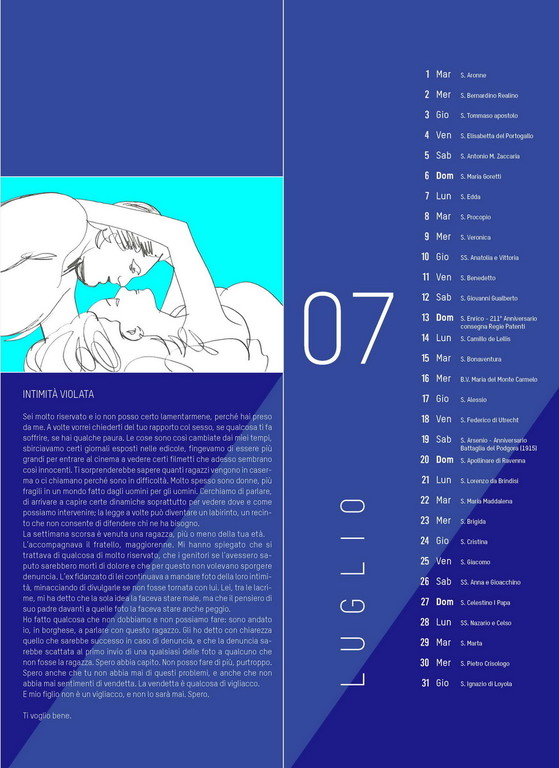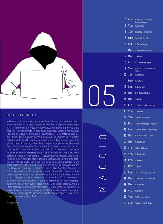 In questo modo, Maurizio de Giovanni riesce a romanzare il rapporto fra nuove generazioni e legalità, con un linguaggio diretto ed empatico, riassumendo l’amore paterno, i valori e la fiducia nelle giovani generazioni in una sorta di testamento morale. Le tavole, invece, raffigurano, nell’inconfondibile stile pop di Marco Lodola, carabinieri delle varie articolazioni dell’Arma e figure giovanili, nella versione cartacea delle “sculture luminose” che lo hanno reso celebre nel mondo. Il calendario vuole valorizzare i giovani, bene inestimabile per tutti e investimento prezioso per il futuro del Paese, richiamando una delle principali attività preventive svolta dall’Arma a loro favore, gli incontri nelle scuole sulla “Cultura delle legalità”, che ambiscono a promuovere conoscenza della legge e cultura civica.