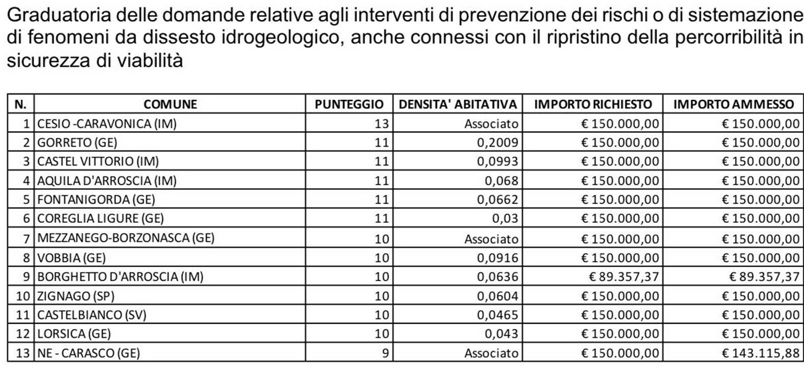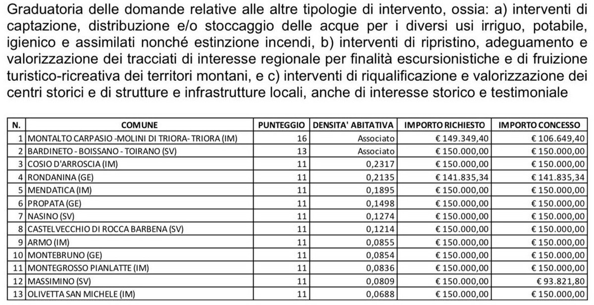 Sono le parole di Alessandro Piana che prosegue: ”Abbiamo ricevuto in totale ben 123 domande, delle quali 69 per la prima linea e 54 per la seconda, un numero che è indicativo dell’interesse dei piccoli Comuni di poter accedere a fondi per effettuare interventi, che altrimenti non avrebbero la forza finanziaria di realizzare. La Commissione di valutazione ha stilato una graduatoria, nella quale sono stati inseriti 26 progetti, 13 per ciascuna linea. Questo bando, che abbiamo fortemente voluto, vede una programmazione e una concertazione congiunta con Anci Liguria a beneficio dei piccoli Comuni. Su disposizione della Giunta regionale dello scorso dicembre, infatti, questa graduatoria rimarrà valida per ulteriori 12 mesi e potrà essere rifinanziata con le risorse dell’annualità corrente".
