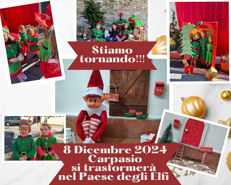 Anche quest'anno grazie ad un gruppo di mamme e di papà e con la popolazione tutta sarà possibile rivivere il giorno 8 di dicembre nella fantastica cornice del borgo di Carpasio la magia degli Elfi che già lo scorso anno ha incantato grandi e piccini.