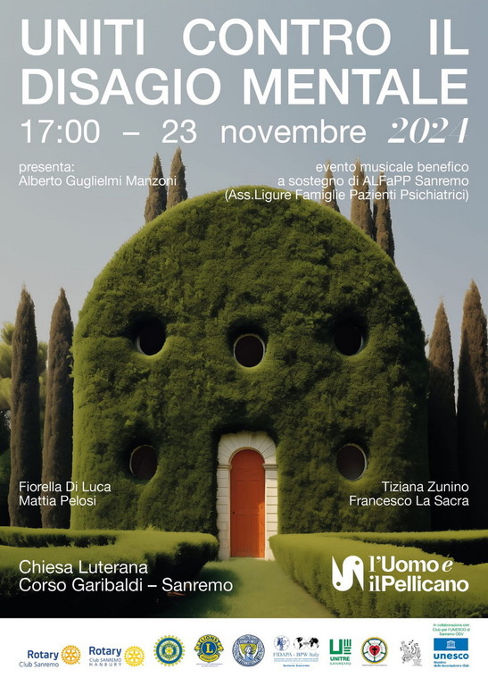 Il 23 novembre presso la Chiesa Luterana (Corso G. Garibaldi – Sanremo), alle ore 17.00, si terrà l’evento musicale benefico Uniti contro il disagio mentale. Ingresso libero. In concerto il soprano Fiorella Di Luca e il tenore Mattia Pelosi, accompagnati al pianoforte dal Maestro Tiziana Zunino. Durante l’evento sono previste letture di brani da parte dell’attore Francesco La Sacra. Quanto ricavato da libere offerte e contributi individuali sarà devoluto ad A.L.Fa.P.P. (Associazione Ligure Famiglie Pazienti Psichiatrici) di Sanremo. Presenta e modera l’evento il Presidente della Fondazione l’Uomo e il Pellicano Alberto Guglielmi Manzoni. Interverranno rappresentanti locali e regionali di A.L.Fa.P.P.