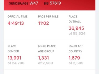 Una sfida fisica ma anche un vero e proprio percorso di trasformazione interiore. "Sono assolutamente soddisfatta dall'esperienza, è andata oltre ogni aspettativa" - sottolinea - "Me lo avevano raccontato ma viverlo in prima persona è qualcosa di incredibile. Non è solo una gara, è un’emozione unica che ti porti dentro per sempre. Questa esperienza mi ha dato la consapevolezza che, con determinazione, costanza e forza di volontà, si può raggiungere qualsiasi risultato. La maratona non è solo una sfida fisica, è anche un viaggio interiore, che ti spinge a confrontarti con i tuoi limiti e a scoprire una forza interiore che nemmeno sapevi di avere. Ora mi sento una versione più determinata e consapevole di me stessa. Sono grata al MICAP – il Master Internazionale in Coaching ad Alte Prestazioni, che sto frequentando, per avermi spinto a partecipare a questa straordinaria manifestazione".