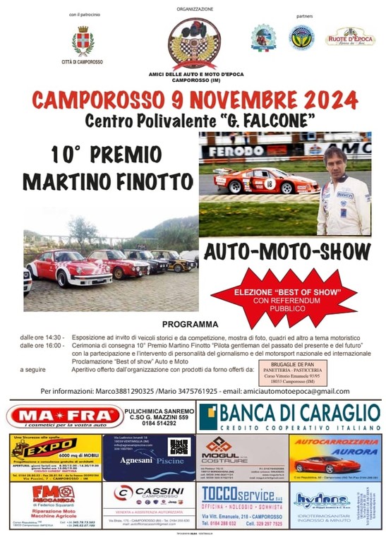 Il tradizionale appuntamento autunnale rivolto a tutti gli appassionati degli sport motoristici e ai collezionisti di veicoli storici del comprensorio intemelio e non solo è organizzato dagli 'Amici delle Auto e Moto d'Epoca' di Camporosso, in collaborazione con gli Amici della Scuderia delle Palme.