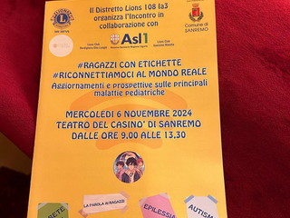 Grande partecipazione e successo mercoledì 6 novembre al Teatro del Casinò di Sanremo al Convegno “#Ragazzi con etichette #Riconnettiamoci al mondo reale” organizzato dal Distretto Lions 108 Ia3 in collaborazione con ASL1 Imperiese, Lions Club Bordighera Otto Luoghi, Lions Club Sanremo Matutia e Adgp Aps. Dati i notevoli risultati di affluenza ed interesse sui social è stato definito come “Un convegno fenomenale”.
