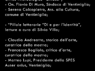 A seguire vi saranno "Pillole letterarie di e per l'identità", letture a cura di Silvia Villa, un intervento teatrale dal sapore gaberiano, e interverranno Claudia Andreotta, storico dell'arte e curatrice della mostra, Francesca Bogliolo, critico d'arte e curatrice della mostra, e Matteo Lupi, presidente della Spes Auser Onlus di Ventimiglia.