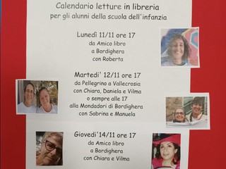 Sono state, inoltre, organizzate letture in libreria per gli alunni della scuola secondaria di primo grado e della scuola dell'infanzia. Oggi pomeriggio, venerdì 15 novembre, alle 17 vi sarà un incontro con Annalisa e Beatrice da Pellegrino a Vallecrosia e, sempre alle 17, è previsto un incontro con Elisa e Luciana alla Mondadori di Bordighera rivolte ai ragazzi della scuola dell'infanzia.