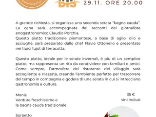 Dopo il successo della prima serata, che ha visto il tutto esaurito, il Ristorante del Villaggio dei Fiori propone per venerdì 29 novembre un nuovo appuntamento dedicato alla “Bagna Cauda”.