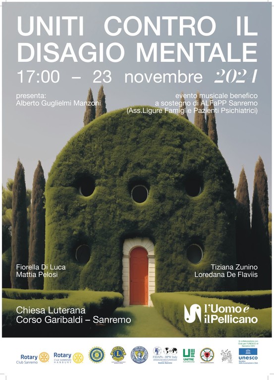 Il prossimo appuntamento organizzato dalla Fondazione l’Uomo e il Pellicano è previsto sabato 23 novembre presso la Chiesa Luterana (Corso G. Garibaldi – Sanremo), alle ore 17.00, con l’evento musicale benefico Uniti contro il disagio mentale. Ingresso libero.