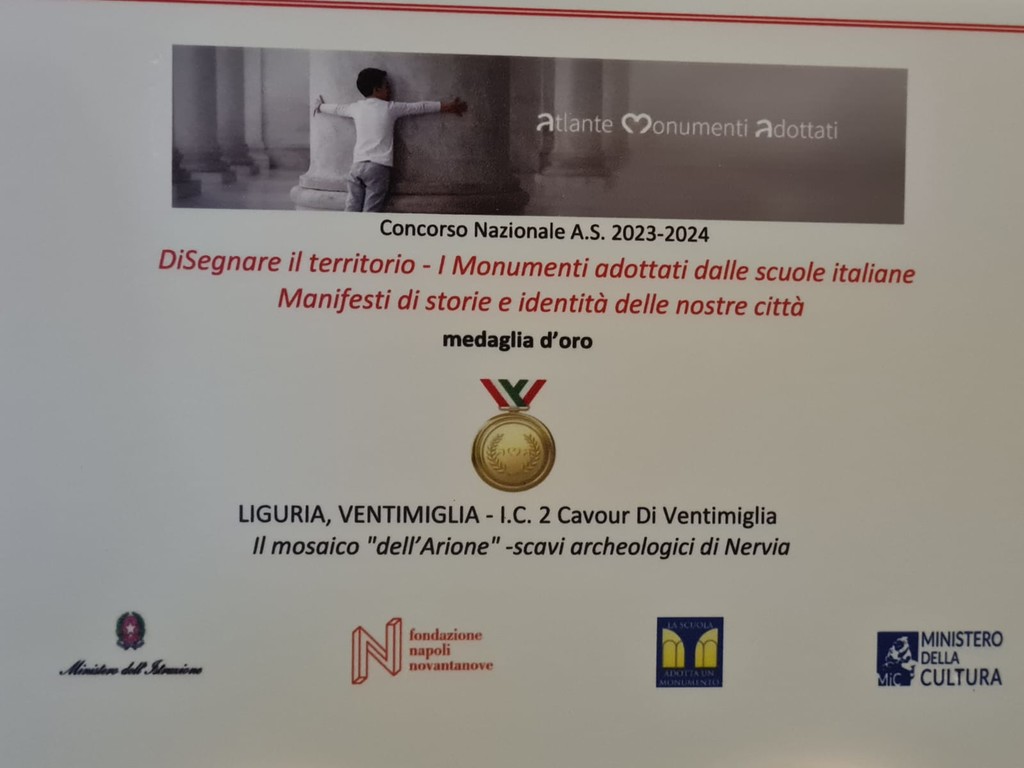 Medaglia d'oro per i bambini della scuola dell’infanzia Regina Margherita di Ventimiglia Alta dell’istituto comprensivo 2 Cavour, diretto dalla dirigente Antonella Costanza con impegno costante per garantire un ambiente educativo stimolante, sicuro e accogliente. Gli studenti hanno, infatti, partecipato e vinto, per la seconda volta, il primo premio del concorso nazionale “La scuola adotta un monumento”, bandito dalla Fondazione Napoli novantanove, per la realizzazione del video “Il Mosaico di Arione” collocato nell’area archeologica di Nervia.