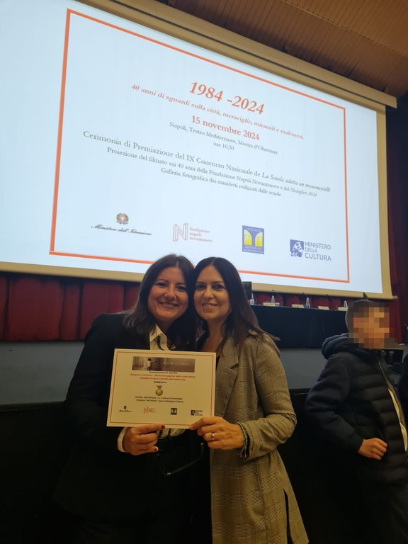 La cerimonia della premiazione si è svolta nel Teatro Mediterraneo della Mostra d’Oltremare di Napoli dove le docenti Roberta Masi e Francesca Grana hanno ricevuto il premio nazionale (medaglia d’oro) dalla dottoressa Mirella Stampa Baracco, presidente della Fondazione Napoli novantanove, e un messaggio del presidente della Repubblica Sergio Mattarella in cui ha espresso le sue congratulazioni ai vincitori di tutti gli ordini di scuola presenti alla cerimonia di premiazione del IX concorso nazionale “La scuola adotta un monumento”.