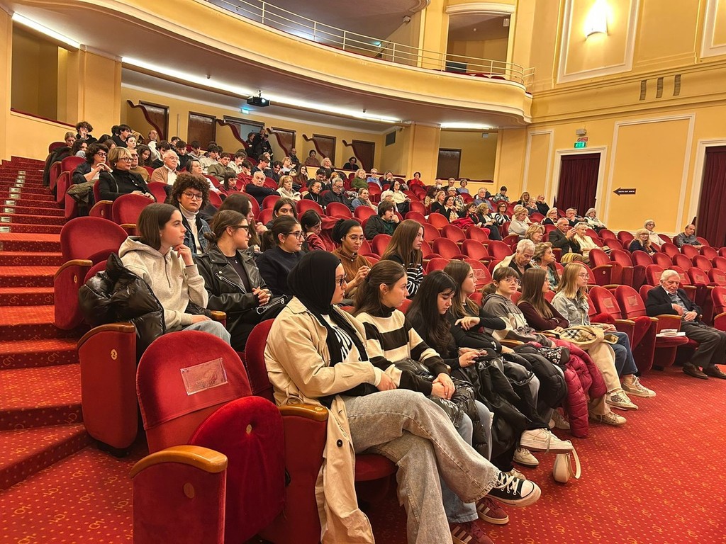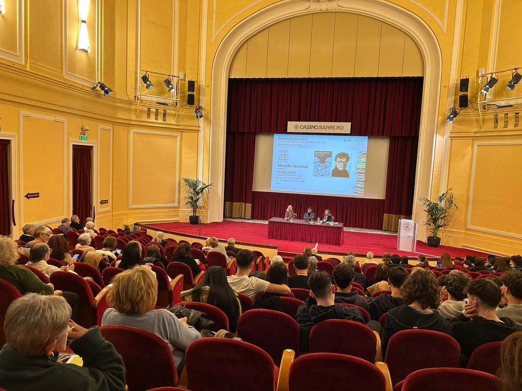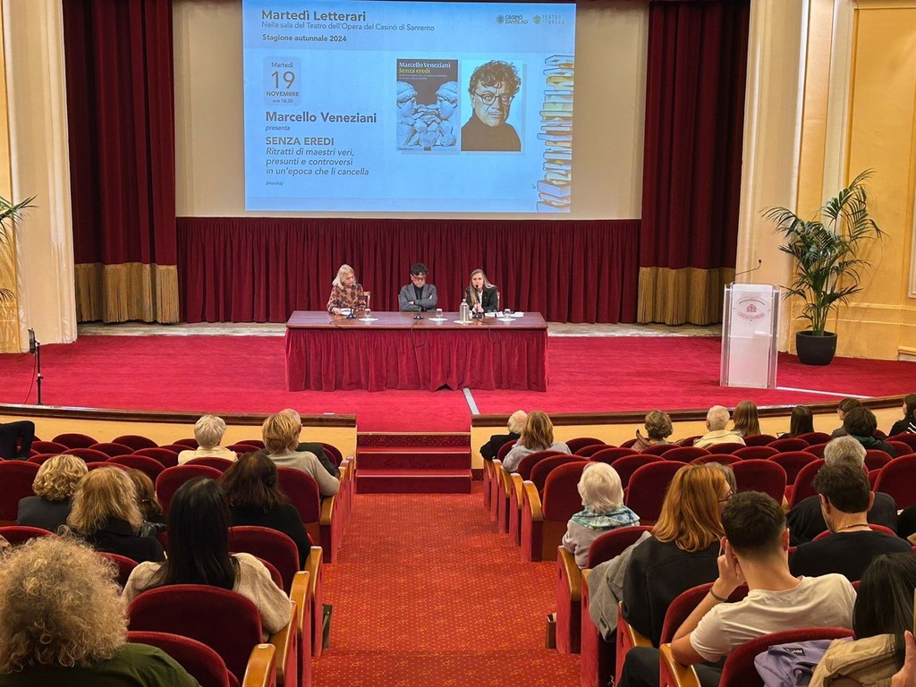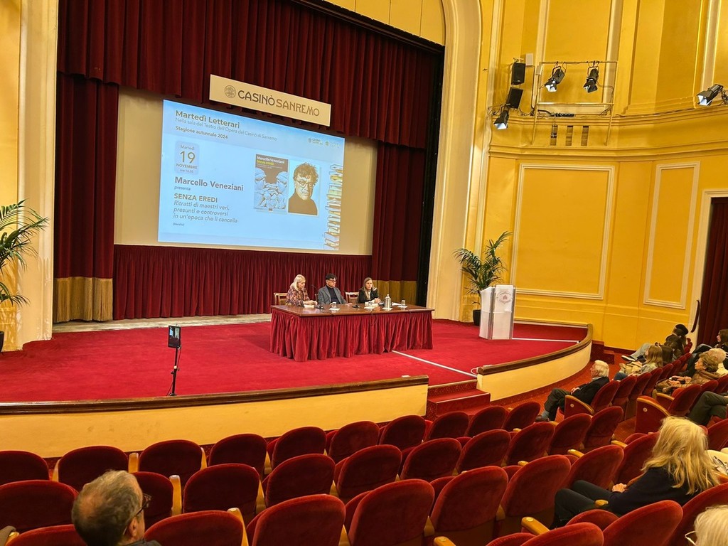 Si è conclusa oggi pomeriggio, al Teatro del Casinò di Sanremo, la presentazione di "Senza eredi. Ritratti di maestri grandi, cattivi e controversi", l’ultimo saggio del filosofo e scrittore Marcello Veneziani. L’evento, inserito nell’ambito della rassegna I Martedì Letterari, ha visto la partecipazione della prof.ssa Stefania Sandra, vice dirigente del Liceo Gian Domenico Cassini, e della moderatrice Marzia Taruffi.