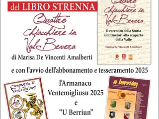"Quattro chiacchiere in val Bevera", il racconto della storia e degli itinerari alla scoperta della valle, di Marisa De Vincenti Amalberti sarà il libro strenna che verrà presentato sabato 30 novembre alle 16.30 presso la sala Sant'Agostino, in piazza Bassi, a Ventimiglia in occasione della festa de 'La Voce Intemelia'.