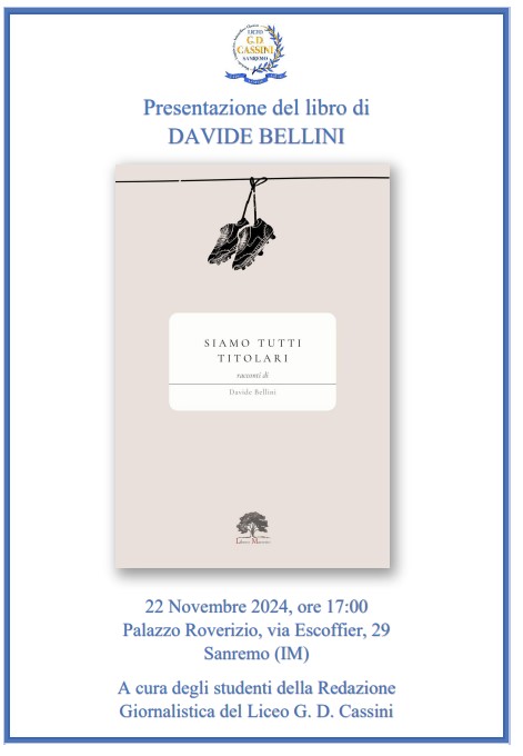 Il dottor Davide Bellini venerdì 22 Novembre presenterà il suo libro “Siamo tutti titolari” ed. La Gru presso Palazzo Roverizio, a Sanremo alle ore 17, durante un evento organizzato dagli studenti della Redazione giornalistica Liceo G.D.Cassini .