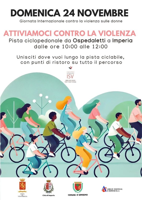 In occasione della “Giornata Internazionale Contro la Violenza sulle Donne”, il Centro Antiviolenza ISV organizza per domenica 24 novembre una passeggiata amatoriale in bicicletta che si svolgerà dalle 10 alle 12 lungo la pista ciclabile che collega Ospedaletti a Imperia.
