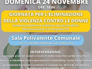 Conferenza ed esibizioni a Vallecrosia in occasione della Giornata per l'eliminazione della violenza contro le donne. Domani, domenica 24 novembre, alle 18 presso la sala polivalente del Comune, sul solettone sud, l'associazione Bethel proporrà una conferenza sulla violenza di genere.