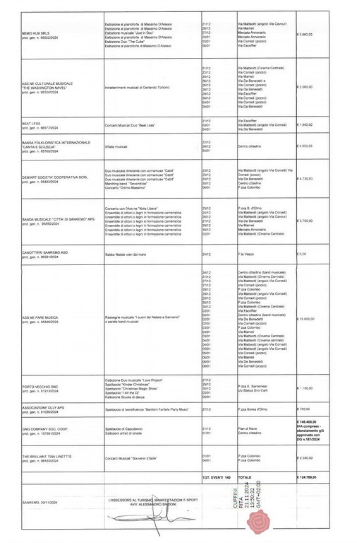 Il Comune di Sanremo ha approvato il programma delle manifestazioni delle festività natalizie 2024-2025, caratterizzato da una serie di iniziative pensate per far vivere alla città la magia del Natale. Con un totale di 140 eventi e una spesa complessiva di 124.789 euro, Sanremo si prepara a offrire un cartellone di eventi di alto livello, in grado di attrarre residenti e turisti.