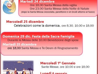 "Martedì 24 dicembre, vigilia di Natale, le celebrazioni della santa messa saranno alle 18 e alle 23. Dopo la celebrazione religiosa della Notte di Natale verranno distribuite cioccolata, panettone e vin brulè attorno al fuoco. Il giorno di Natale, invece, le celebrazioni saranno alle 8.30, alle 10 e alle 18" - afferma don Rito - "Domenica 29 dicembre è prevista la Festa della Sacra Famiglia. Alle 10, durante la santa messa, vi sarà la solenne benedizione per tutti gli sposi. Il 31 dicembre, invece, alle 18 vi sarà la santa messa e Te Deum di ringraziamento".