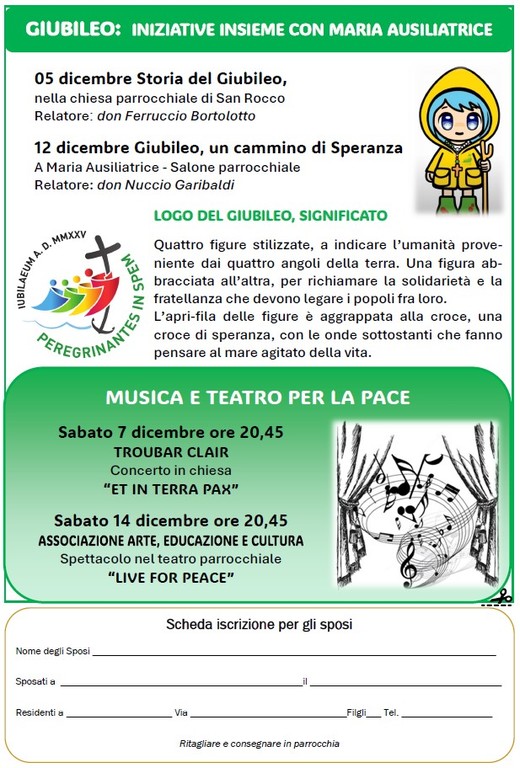In programma sono previste anche iniziative organizzate insieme alla parrocchia di Maria Ausiliatrice. "Faremo degli incontri di formazione insieme alla parrocchia di Maria Ausiliatrice per conoscere il Giubileo e il messaggio di speranza. Il 5 dicembre si parlerà della 'Storia del Giubileo' nella chiesa parrocchiale di San Rocco. Il relatore sarà don Ferruccio Bortolotto" - dichiara don Rito - "Il 12 dicembre nel salone parrocchiale di Maria Ausiliatrice don Nuccio Garibaldi sarà il relatore di 'Un cammino di speranza'".