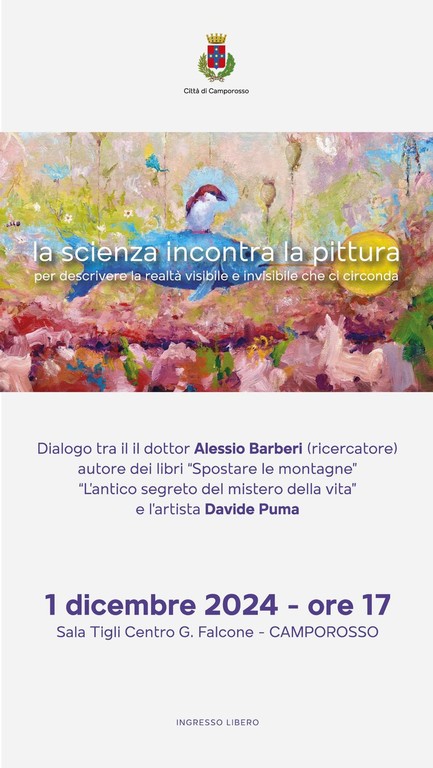 "La scienza incontra la pittura" darà il via al calendario delle manifestazioni proposto dal comune di Camporosso in occasione delle festività natalizie. Un dialogo tra il ricercatore Alessio Barberi, autore dei libri "Spostare le montagne" e "L'antico segreto del mistero della vita", e l'artista Davide Puma andrà in scena domenica 1 dicembre alle 17 in sala Tigli al centro G. Falcone.