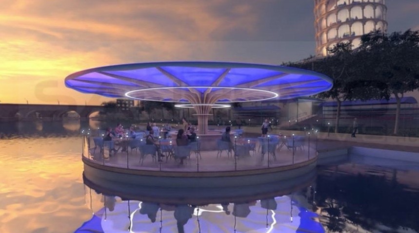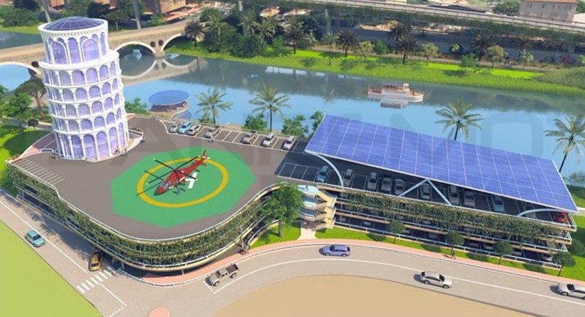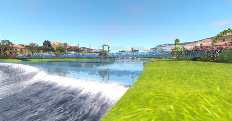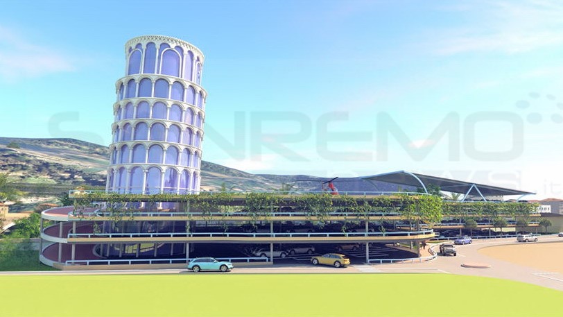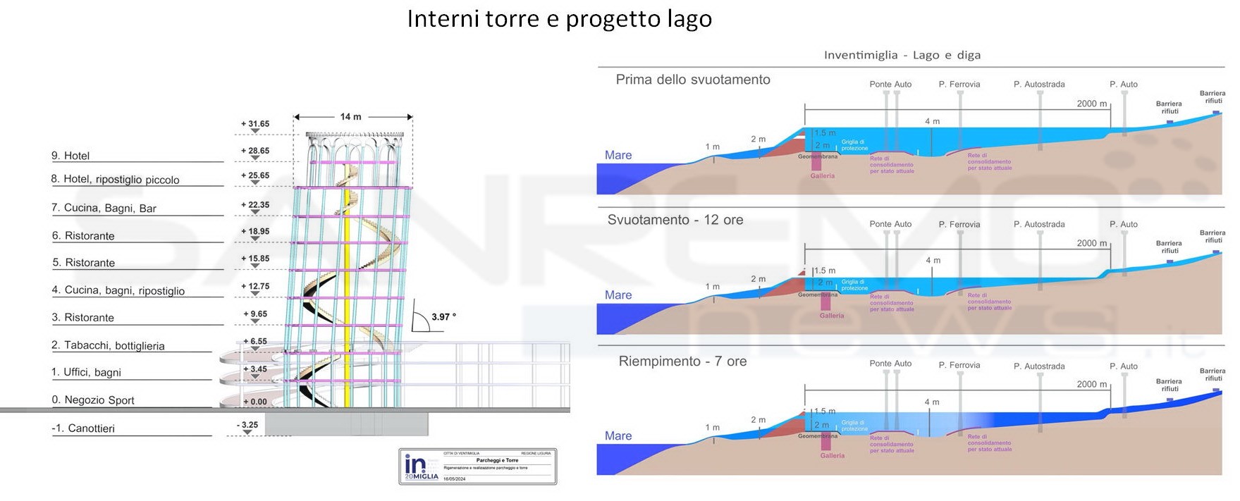 Si parla anche di un altro posteggio: “Verrà realizzato nella prima fase operativa all’entrata di Ventimiglia, ai confini del Roya, dov’è già presente un parcheggio all’aperto, che verrà sopraelevato di tre piani, interamente coperti, comprendente 300 posti auto, oltre ai 104 già presenti. Nel lato esterno verso il lago, all’interno della struttura dei parcheggi, verrà realizzato un fabbricato a forma di torre, con ristoranti, rooftop american bar, negozi, tabaccheria, alimentari, vini e liquori, souvenir, uffici amministrativi del lago, due piani di appartamenti panoramici di lusso, uso hotel e foresteria degli artisti vip e la sede dell’associazione Canottaggio di Ventimiglia, che potrà offrire agli associati i propri servizi sul lago”.