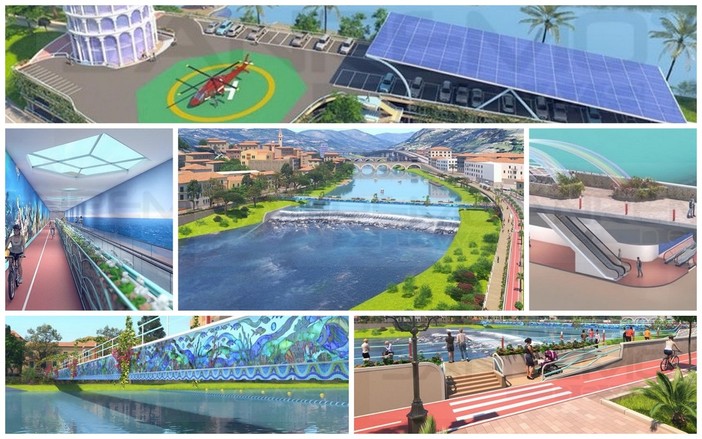 In merito al più ampio progetto di rigenerazione urbana: “Coinvolge il centro e la foce sul fiume Roya - afferma Schiavolini - lato sud est di Ventimiglia alta, con riqualificazione del mercato annonario senza l’abbattimento dei muri, elevazione di nuovi piani, con self service, ristorante panoramico, piscina comunale, solarium, diversi bar, particolare parco giochi, sala concerti, spazi espositivi, grande parcheggio interrato, posto sotto il mercato e Palazzo Aprosio, contenente garage, magazzini, e servizi logistici per l’attività di mercato e tanto altro ancora. Il rifacimento di Palazzo Aprosio, in particolare, prevede la realizzazione di uffici, studio di registrazione audio/video collegato ai teatri, con echo chamber e camera anecoica, situate nel sottosuolo dell’edificio, campus universitario e potremmo continuare. Quindi, abbiamo un centro fieristico completo di tutti i servizi, galleria commerciale, con parcheggi interrati, alcune isole ecologiche interrate per centri storici, la pedonalizzazione di via Martiri della Libertà, con accesso mediante sottopasso stradale, all’innovativo tunnel ciclopedonale, posto sotto fiume, trasformato in lago/bacino di laminazione naturale, navigabile e balneabile, e conforme alle nuove disposizioni dell’Europa che formerà una rapida, aventi spiagge e con una lunga Promenade alberata, che costeggia la parte iniziale del lago e termina in via Tenda, dove verrà realizzata una grande statua con all’interno una fontana e una passerella pedonale, da noi progettata”.