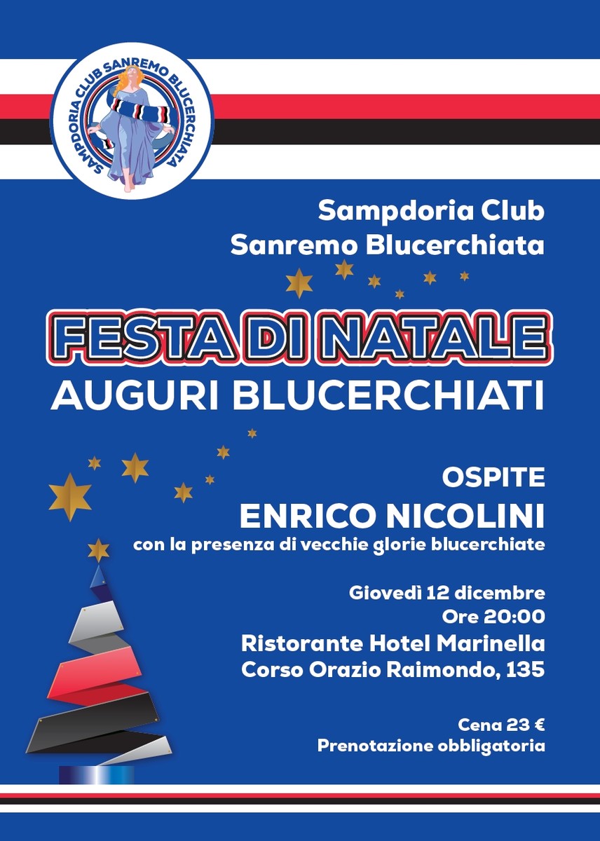 Il Sampdoria Club Sanremo Blucerchiata organizza la festa degli Auguri Blucerchiati, un momento speciale per celebrare insieme lo spirito natalizio e la passione per i colori della maglia più bella del mondo. L’appuntamento è fissato per giovedì prossimo al Ristorante dell’Hotel Marinella di Sanremo, dove tifosi e simpatizzanti si ritroveranno per una cena all’insegna della convivialità e dell’amore per la Sampdoria.