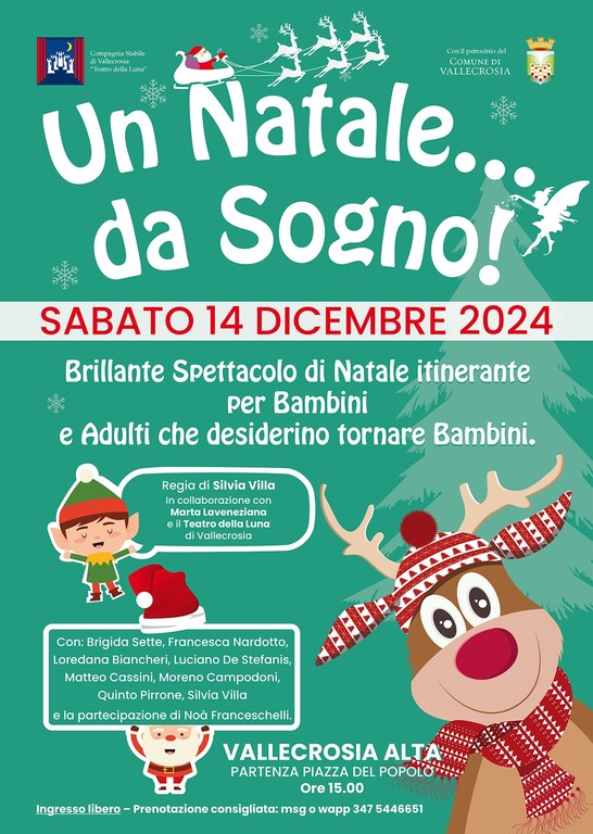 Sabato prossimo, il 14 dicembre, alle 15, verrà portato in scena lo spettacolo di Silvia Villa, in collaborazione con Marta Laveneziana e il Teatro della Luna, nel centro storico della città della famiglia e prenderà il via da piazza del Popolo. "Festeggiamo l’arrivo del Natale con 'Un Natale...da Sogno!'" - fa sapere Silvia Villa, attrice e regista - "Un brillante spettacolo teatrale itinerante con animazione partecipata andrà in scena nei magici borghi di Vallecrosia Alta e Costarainera. E' adatto sia per bambini che per adulti che hanno voglia di tornare bambini".