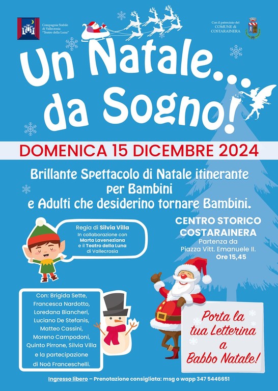 Lo spettacolo verrà riproposto domenica prossima, il 15 dicembre, alle 15.45 a Costarainera e partirà da piazza V. Emanuele II. "Variopinte fate, elfi giocolieri, angeli canterini e originali personaggi in costume tra leggenda e realtà accompagneranno il pubblico in un viaggio natalizio interattivo tra le porte dipinte di Vallecrosia Alta e nei suggestivi caruggi del centro storico di Costarainera, che accenderà o ri-accenderà nei cuori la voglia di sognare ancora" - svela Villa - "Al termine dello spettacolo si offrirà cioccolata calda a Vallecrosia Alta e una merenda golosa a cura dell’associazione 'Gocce di Natura' a Costarainera e per l’occasione arriverà anche Babbo Natale a cui poter consegnare le vostre letterine".