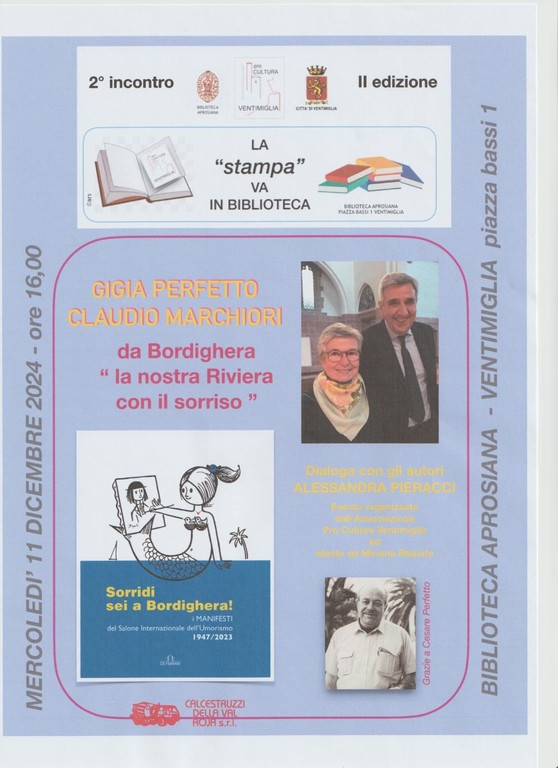 Aneddoti, curiosità e ricordi sul Salone Internazionale dell’Umorismo di Bordighera sono stati raccontati nel secondo appuntamento de "La stampa in Biblioteca", ideato da Miriana Rebaudo e organizzato dall’associazione Pro Cultura Ventimiglia, andato in scena oggi pomeriggio presso la Biblioteca Aprosiana in piazza Bassi 1, accanto alla chiesa di Sant’Agostino. Gigia Perfetto e Claudio Marchiori hanno presentato al pubblico presente il libro “Sorridi sei a Bordighera”.