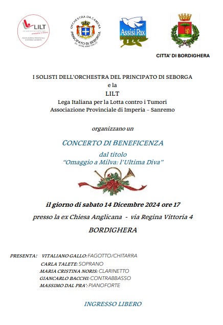 I Solisti di Seborga insieme alla L.I.L.T. Sanremo, Lega Italiana Lotta Tumori, organizzano un concerto di beneficenza in data 14 Dicembre alle ore 17,oo nel Centro Culturale (ex chiesa Anglicana) in via Regina Vittoria,4 a Bordighera, dal titolo Omaggio a Milva (Ultima Diva).