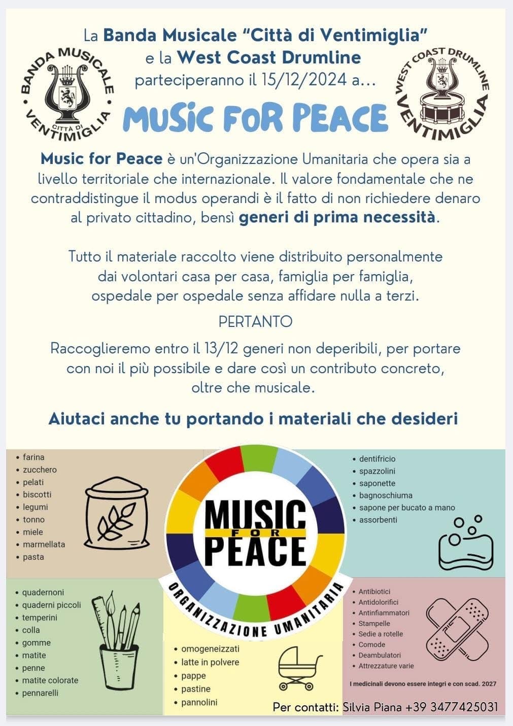 La cittadinanza di Ventimiglia e quella dei comuni limitrofi, hanno dimostrato gran cuore ed grande spirito solidale e grazie ai loro contributi sono stati raccolti e consegnati ieri 300 kg di beni di prima necessità. Un grande ringraziamento è stato rivolto dai membri di “Music for Peace” ai musicanti e a tutti coloro che hanno contribuito con i loro doni a portare gioia a chi sta attraversando un momento di difficoltà.