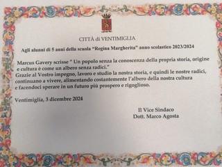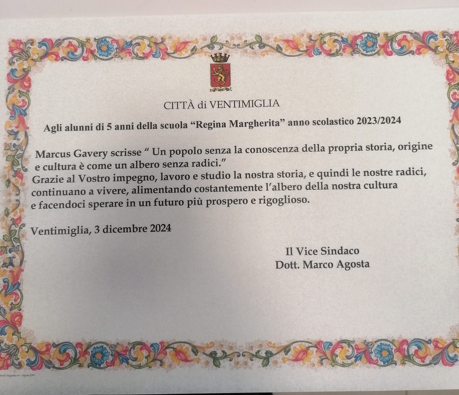 Il 3 dicembre 2024 presso la scuola dell’infanzia Regina Margherita di Ventimiglia alta dell’IC 2 Cavour, si è tenuta, presieduta dalla Dirigente scolastica Dott.ssa Antonella Costanza, la cerimonia di presentazione della Medaglia d’oro, conseguita dagli alunni che hanno frequentato la scuola dell’infanzia nell’anno scolastico 2023/24.