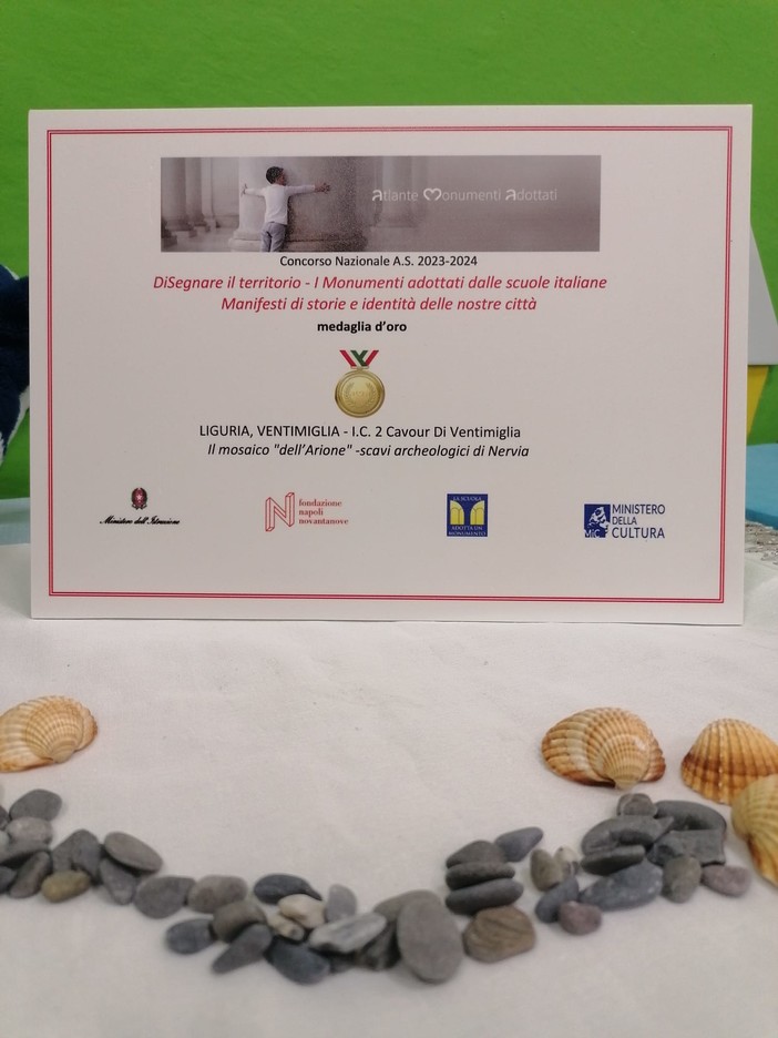 I piccoli alunni hanno adottato “Il Mosaico di Arione”, un capolavoro di epoca romanica custodita nell’area archeologica di Nervia a Ventimiglia. Hanno elaborato un video con disegni ed illustrazioni con riferimento all’opera in oggetto, della quale hanno costruito un rilievo in miniatura donato ai vertici dell’area archeologica di Nervia. Ed è grazie all’opera didattica ed alla volontà delle docenti ed alle direttive della Dott.ssa Antonella Costanza che i piccoli alunni iniziano a coltivare il seme della conoscenza del passato, imparando ad apprezzarne i contenuti e poter così guardare al futuro; solo conoscendo le proprie radici si può costruire il domani.