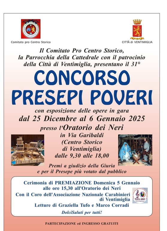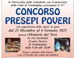 Come ogni anno nell’Oratorio dei “Neri” a Ventimiglia si svolgerà il Concorso Presepi Poveri, un concorso che vede la presenza di molti presepi preparati da privati, associazioni, istituti scolastici, parrocchie. Chi desidera partecipare può portare il suo lavoro direttamente all’Oratorio dei Neri, sito in Via Garibaldi a Ventimiglia Alta,dalle 10 alle 18 corredandolo di un foglio con nome, cognome, numero di telefono ed email dell’autore, sono ammessi tutti i tipi di materiale e tutte le tecniche, iscrizione e partecipazione gratuiti.