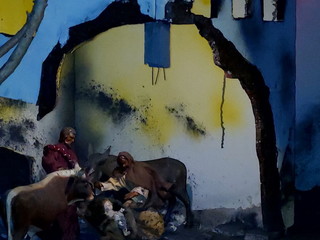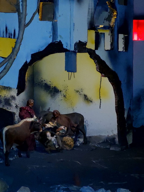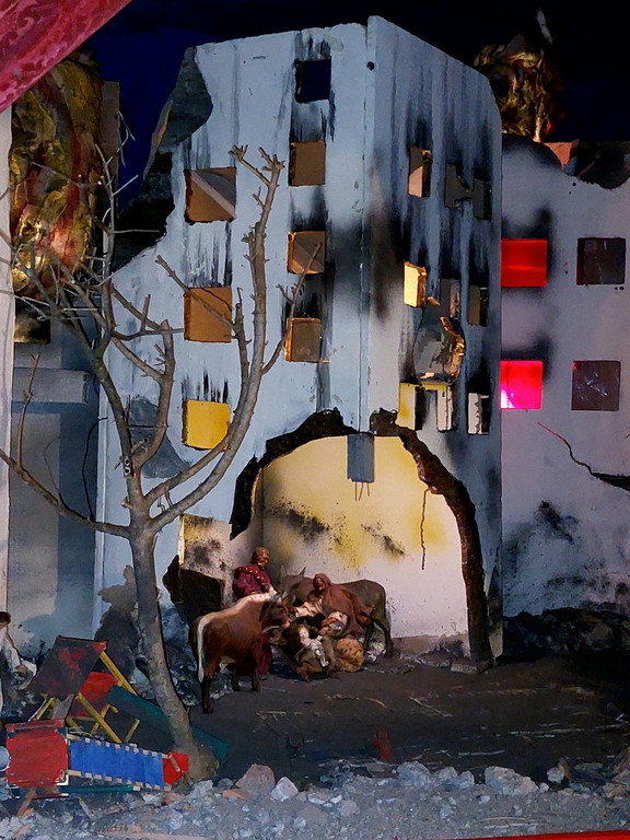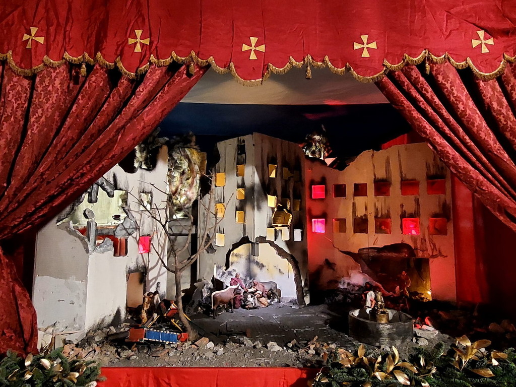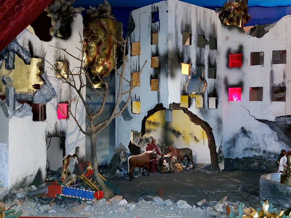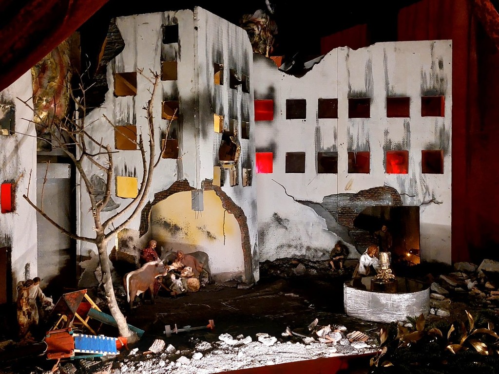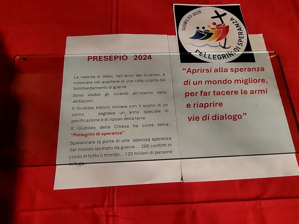 "La nascita di Gesù, nell’anno del Giubileo, è collocata nel quartiere di una città colpita da bombardamento di guerra - si legge nella descrizione - Sono visibili gli incendi all’interno delle abitazioni. Il Giubileo biblico iniziava con il suono di un corno: segnava un anno speciale di pacificazione e di riposo della terra. Il Giubileo della Chiesa ha come tema: 'Pellegrini di speranza'. Spalancare la porta di una operosa speranza nel mondo lacerato da guerre: 200 conflitti in corso in tutto il mondo... 120 milioni di persone in fuga”.