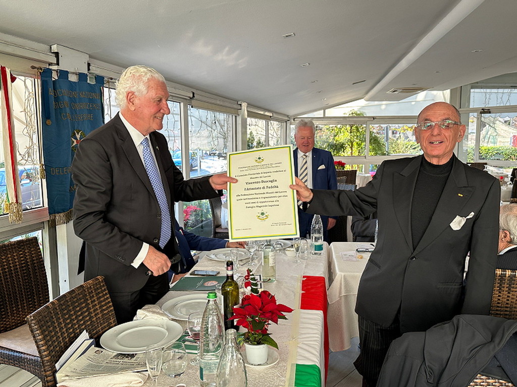 Tra i riconoscimenti della giornata, il MdL Vincenzo Buscaglia ha ricevuto un attestato per i suoi 20 anni di appartenenza all’associazione, mentre il Delegato Provinciale Roberto Pecchinino ha conferito medaglie di benemerenza al Console Provinciale Salvatore Napoli e alla sig.ra Costanza Pireri, già vicesindaco e attuale Presidente della LILT, per il loro costante supporto alle iniziative dell’ANIOC. Un momento speciale è stato riservato dal Delegato Provinciale Cav. Uff. Roberto Pecchinino per fare i complimenti, a nome di tutti gli Insigniti ANIOC, al Cav. Uff. Salvatore Napoli per il recente conferimento del titolo di "Console Emerito MdL Estero", ricevuto il 19 dicembre. Un riconoscimento che premia l’attività svolta dal Console Provinciale MdL Salvatore Napoli, nel corso degli anni e il suo continuo impegno a favore della Famiglia Magistrale.