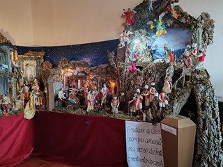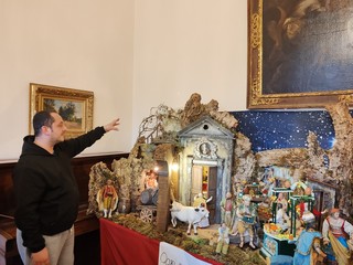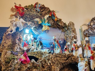Sacra Famiglia, angeli e mestieri. Tradizione e simbologia si amalgamano perfettamente nel presepe napoletano del '700 allestito nell'ex seminario a Bordighera.