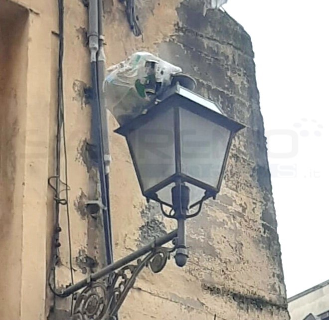 Sanremo: lampione di via De Benedetti 'centrato' da un... sacchetto dell'immondizia, colpo da guinness (Foto)