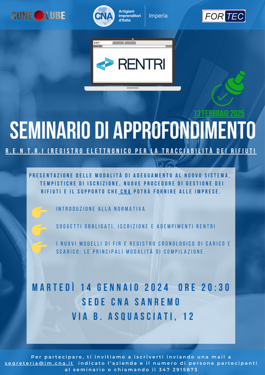 CNA Imperia organizza un seminario rivolto a tutte le imprese, con particolare attenzione agli artigiani del territorio, per approfondire il tema del RENTRI (Registro Elettronico Nazionale per la Tracciabilità dei Rifiuti). L’appuntamento è fissato per martedì 14 gennaio 2025 alle ore 20:30, presso la sede CNA di Sanremo in Via B. Asquasciati, 12.