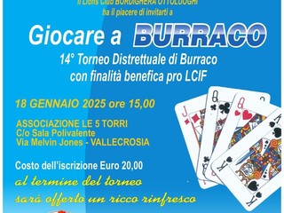 A partire dalle 15 chi vorrà potrà iscriversi e partecipare al 14esimo torneo distrettuale di burraco con finalità benefica pro LCIF. Al termine del torneo verrà offerto un rinfresco.