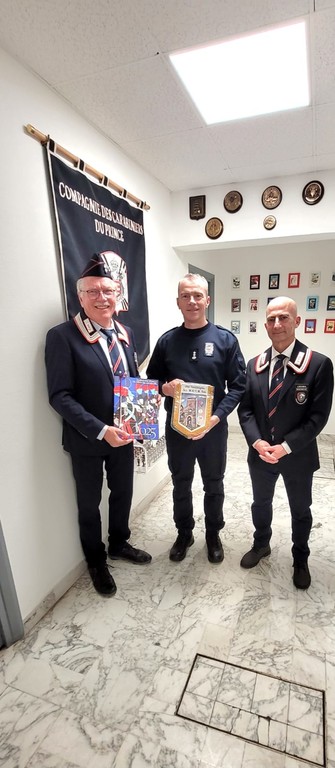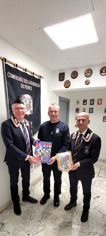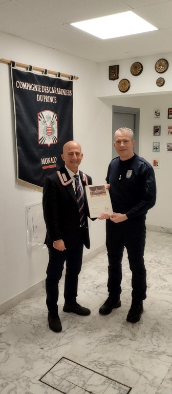 Il presidente dell'associazione nazionale carabinieri sez. MOVM Fois di Ventimiglia, Ernesto Fresca Fantoni, e il segretario Rino Aliquo' sono stati ricevuti dal comandante dei carabinieri del Principe di Monaco, il tenente colonello Martial Pied, per gli scambi augurali, la consegna del calendario storico dell'Arma 2025 e del nuovo gagliardetto dell'associazione. Il direttore del coro Anc Ventimigliese Rino Aliquo' ha, inoltre, consegnato la brochure del neo coro al comandante Pied che si è complimentato per questa lodevole iniziativa.