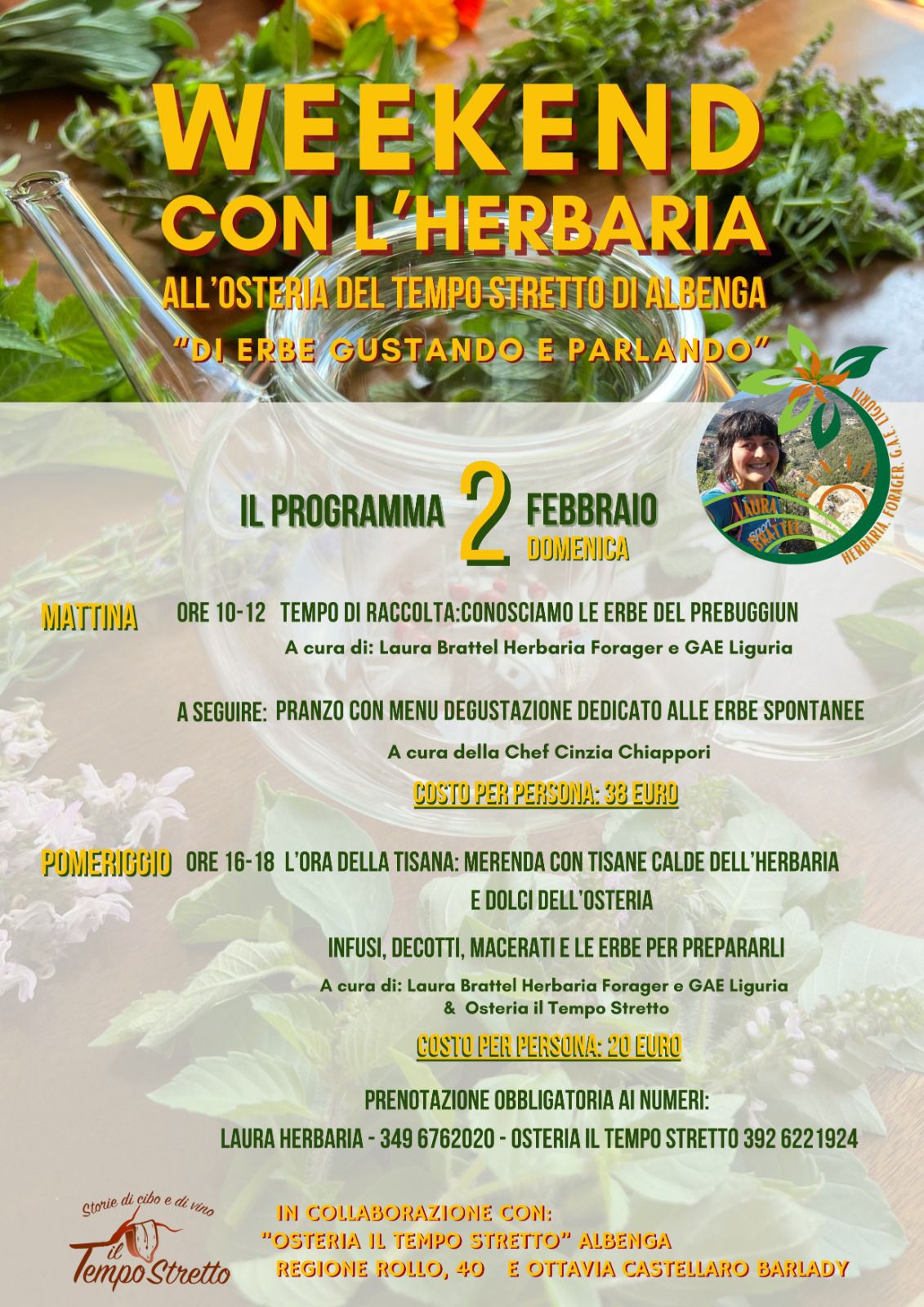 L'Osteria del Tempo Stretto di Albenga vi invita a immergervi nel mondo delle erbe spontanee con un weekend indimenticabile. Nei giorni 1 e 2 febbraio, l'Herbaria Forager e GAE Liguria Laura Brattel, insieme al team dell'Osteria, vi guiderà alla scoperta delle proprietà benefiche e dei mille usi delle erbe spontanee.