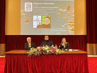 Il giornalista e divulgatore scientifico Roberto Giacobbo ha presentato il suo ultimo libro, "Storia alternativa del mondo. Un viaggio pieno di sorprese nel cammino dell'uomo. Dalle piramidi ai giorni nostri" (Mondadori) ai martedì letterari del Casinò di Sanremo. A dialogare con lui il giornalista e saggista Carlo Sburlati.