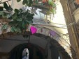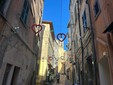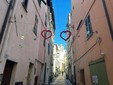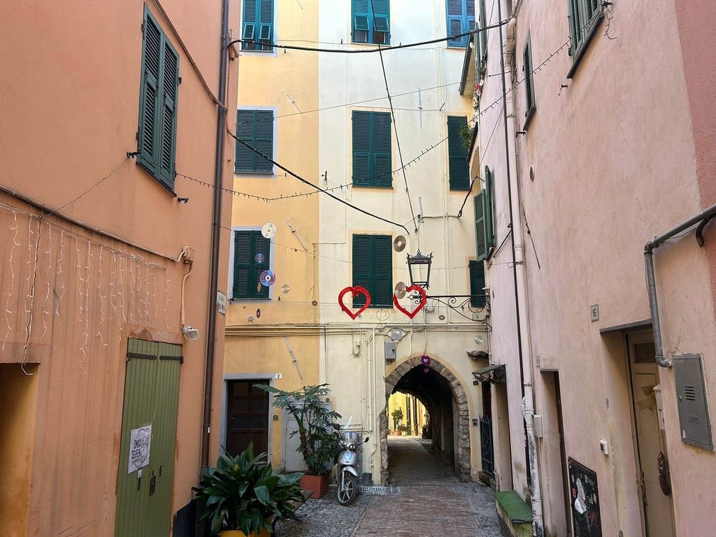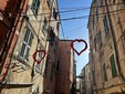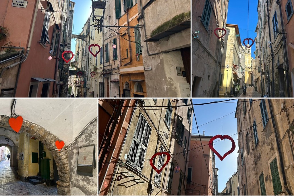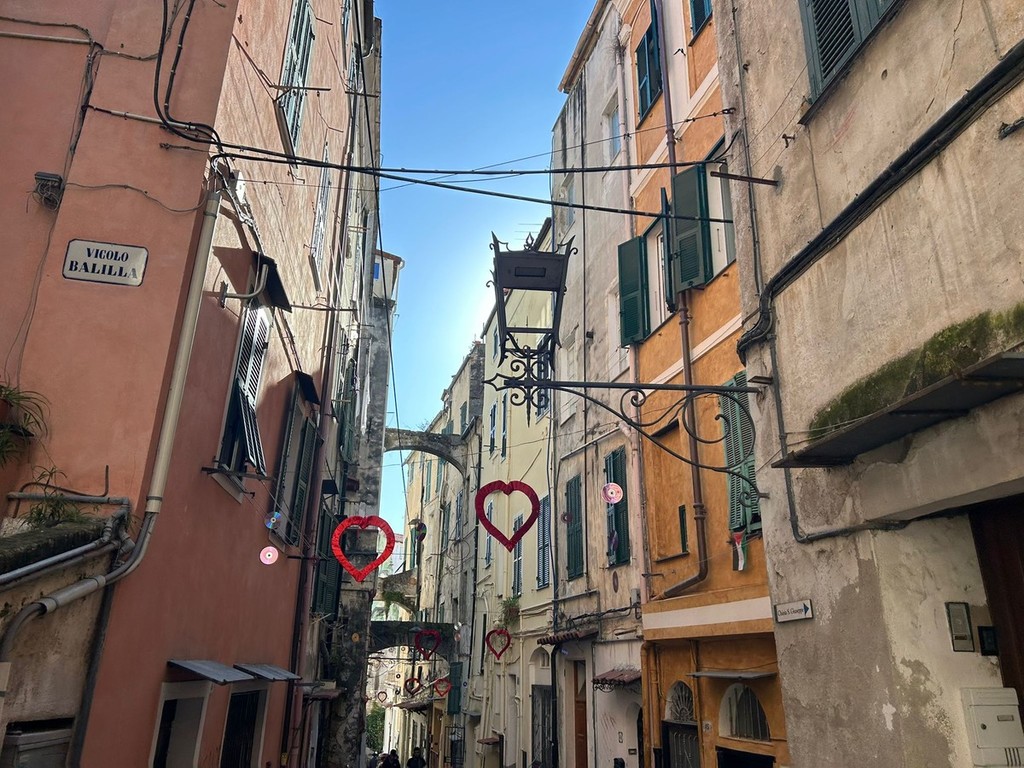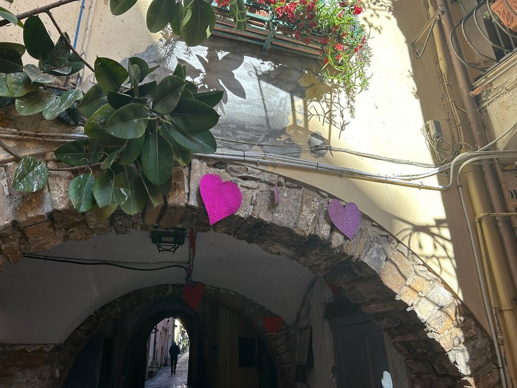 Sospesa tra il fascino decadente e autentico della città vecchia e l’anima festosa di Sanremo, via Palma racconta la musica. Le decorazioni, appese con cura ai fili che attraversano la via, rimandano immediatamente alla kermesse musicale: note danzanti sui muri, vinili che girano al vento, cuori che sembrano pulsare al ritmo delle canzoni. Qui, tra i vicoli stretti e le scalinate che si rincorrono, sembra di respirare un’aria che mescola l’anima di Napoli e Lisbona, un abbraccio tra sud e occidente, tra malinconia e festa.