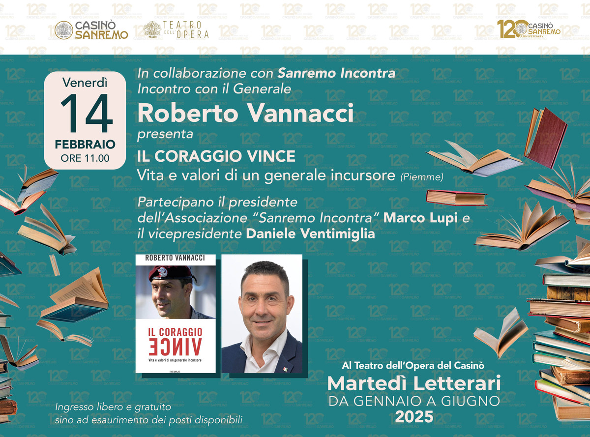 Su iniziativa dell’associazione culturale ‘Sanremo Incontra’, presieduta da Marco Lupi e che vede come vice Presidente Daniele Ventimiglia, Vannacci sarà a Sanremo venerdì 14 febbraio, proprio durante la settimana festivaliera, per presentare il libro ‘Il coraggio vince’. L’appuntamento è fissato per le 11, ovviamente nella sede classica dei ‘Martedì’ (in questo caso in un altro giorno) al Teatro dell’Opera.