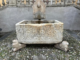 L'opera ospita una vasca in marmo bianco di Carrara, risalente al XII secolo e probabilmente proveniente dalla zona di Aquileia. Il suo rilievo decorativo è composto da una fettuccia continua che racchiude clipei raffiguranti diversi animali, ognuno scolpito con una maestria che rimanda ai canoni bizantini e adriatici. Esemplari simili si trovano solo in luoghi di prestigio, come San Marco a Venezia e l’abbazia di Pomposa. Rimane ancora un mistero la sua funzione originaria, ma la sua bellezza e il valore storico, però, sono indiscutibili.