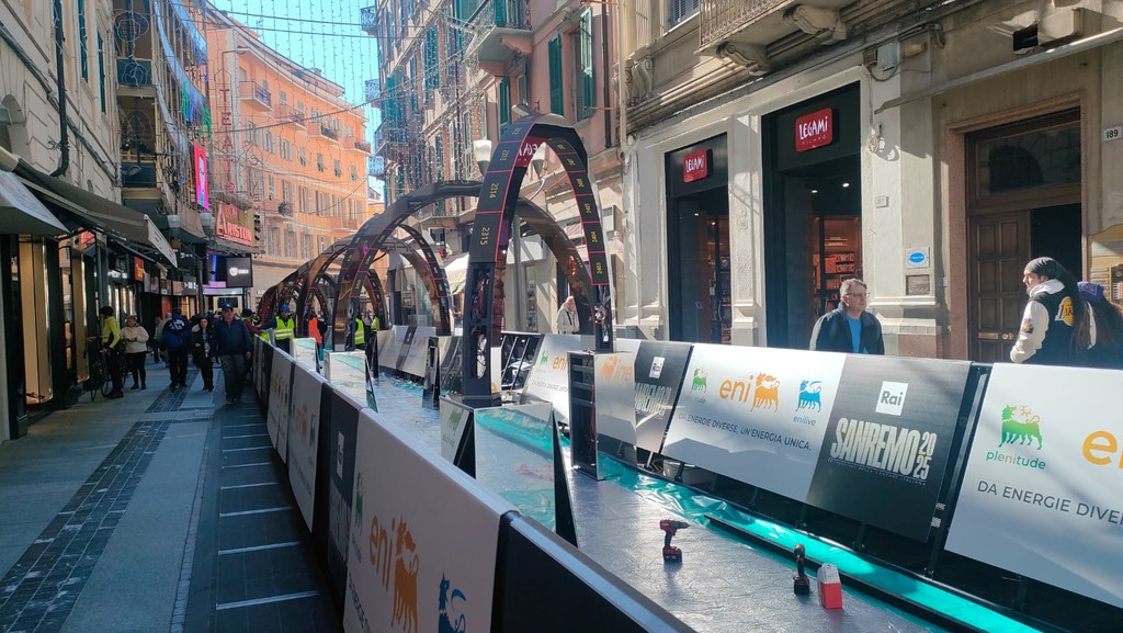 Anche in piazza Borea d'Olmo , il cosiddetto vetro destinato ad ospitare le trasmissioni del Prima e Dopo Festival è ormai quasi pronto. I lavori che circondano la struttura stanno procedendo rapidamente, con l'installazione degli ultimi dettagli. Un ruolo centrale in questa cornice lo gioca il Green Enicarpet , il percorso che accompagnerà artisti e ospiti verso i principali eventi della settimana. Gli archi luminosi , già montati, hanno animato la serata di ieri con le prime suggestive prove di luci, creando un'atmosfera magica lungo il percorso.